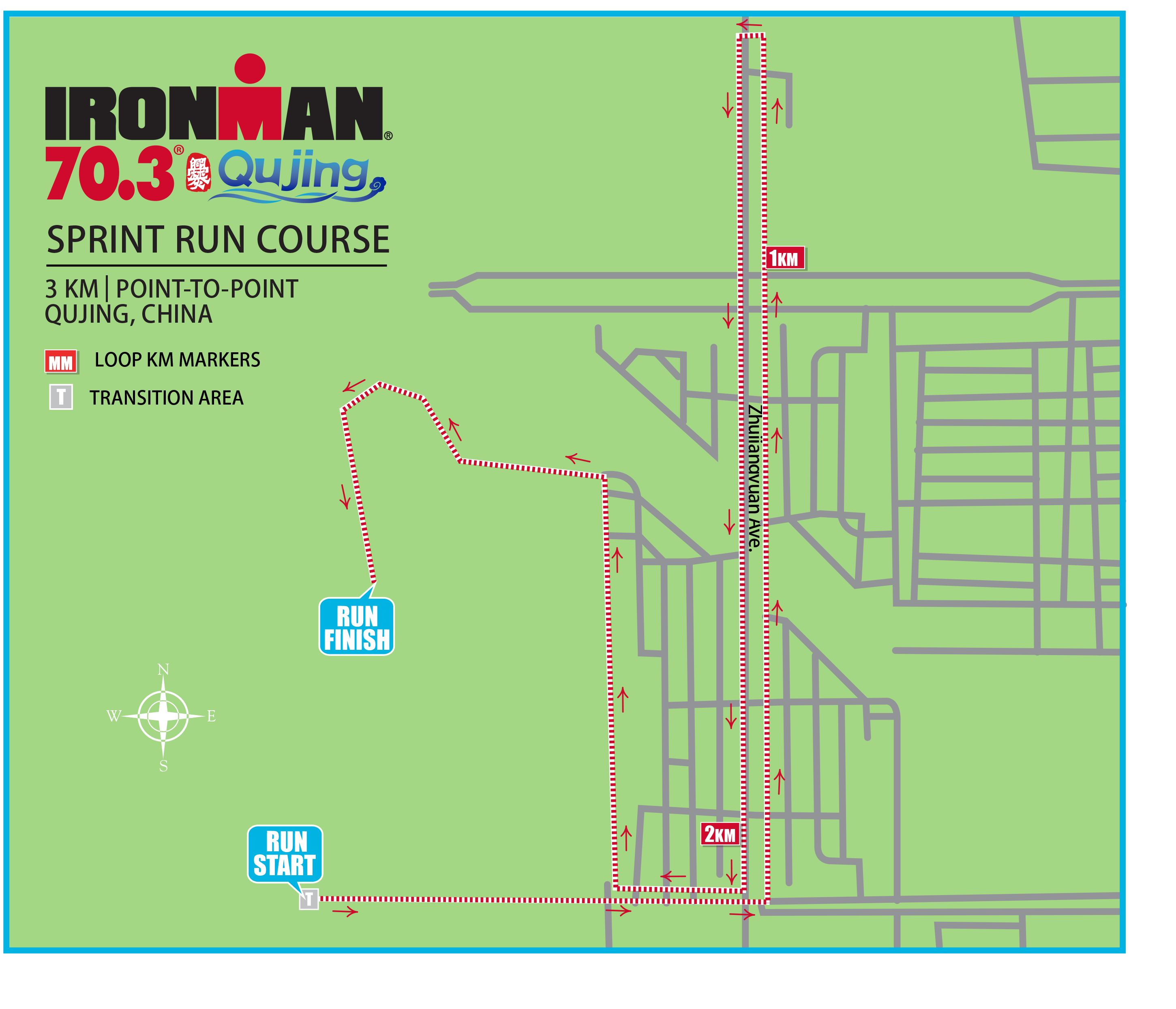跑步项目将会绕着曲靖市文化体育公园跑一圈,运动员在沿途可以欣赏到曲靖市古建筑和现代体育场两种风格完美结合的壮美景色。终点线设在新足球场和篮球馆中间的大广场,运动员将在这里见证完成比赛这一最珍贵的时刻。